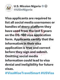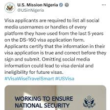 The U.S. Mission in Nigeria issued this directive to visa applicants, mandating the disclosure of all social media usernames and handles used over the past five years as part of the visa application process.