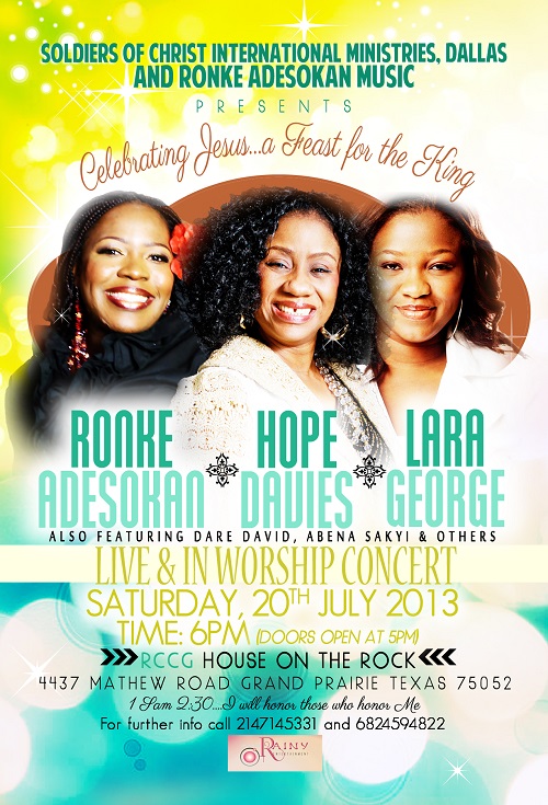 Celebrating Jesus_DallasLIKE in the days of old, United States is about to witness a mighty outpouring of the power of God Almighty as a music revival aimed at bringing down the glory of the Most High would be brought down this Saturday, July 20, 2013 at Redeemed Christian Church of God, (RCCG) House on the Rock, when ‘Soldiers of Christ International Ministries’ led by Ronke Adesokan, an angelic minstrel, ably assisted by Lara George, a star female gospel artist and Hope Davies would be celebrating ‘Jesus Festival’; a revival of sort in Dallas, Texas.