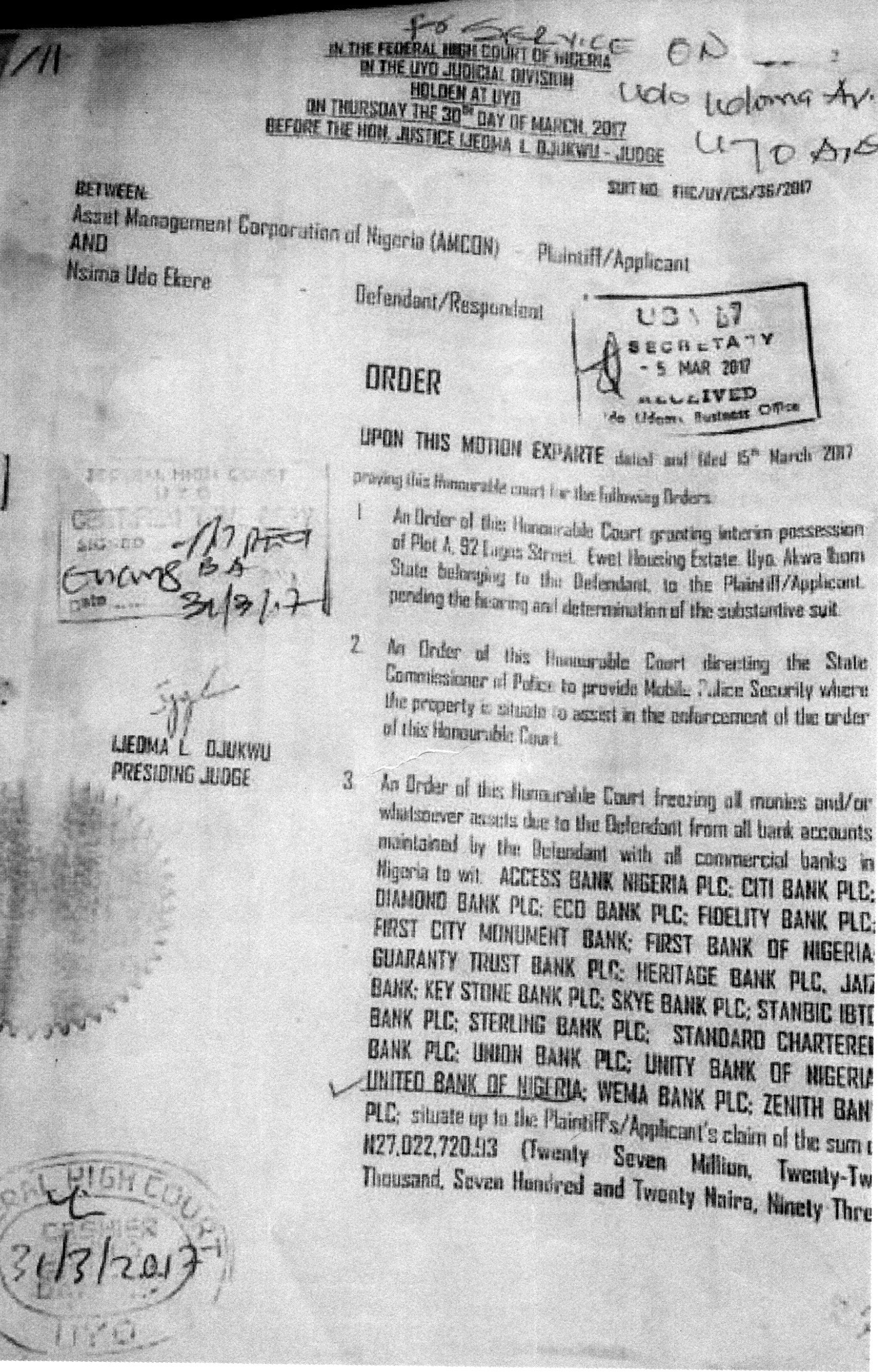 The ruling went on to state “that an order is granted freezing all monies and/ or whatsoever assets due to the Defendant from all bank accounts maintained by the Defendant with all commercial banks in Nigeria to wit: ACCESS BANK NIGERIA PLC, CITI BANK PLC, DIAMOND BANK PLC, ECO BANK PLC, FIDELITY BANK PLC, FIRST CITY MONUMENTAL BANK, FIRST BANK OF NIGERIA, GUARANTY TRUST BANK PLC, HERITAGE BANK PLC, JAIZ BANK, KEYSTONE BANK PLC, SKYE BANK PLC, STANBIC IBTC BANK PLC, STERLING BANK PLC, STANDARD CHARTERED BANK PLC, UNION BANK PLC, UNITY BANK OF NIGERIA, UNITED BANK OF NIGERIA, WEMA BANK PLC, ZENITH BANK PLC, situate up to the Plaintiff/Applicant’s claim of the sum of N27,022,720.93 (Twenty Seven Million, Twenty-Two thousand, Seven hundred and Twenty Naira, Ninety Three Kobo) only being a debt owed by the Defendant as at 20th February 2017in respect to the credit facility granted to the Defendant/Respondent by the defunct Oceanic Bank International Plc. (now Eco Bank Plc.).