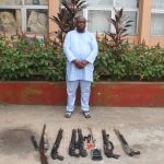 Upon his arrest, six pump action guns, three cartridge bullets, a swagger stick and several forged documents were recovered from him.