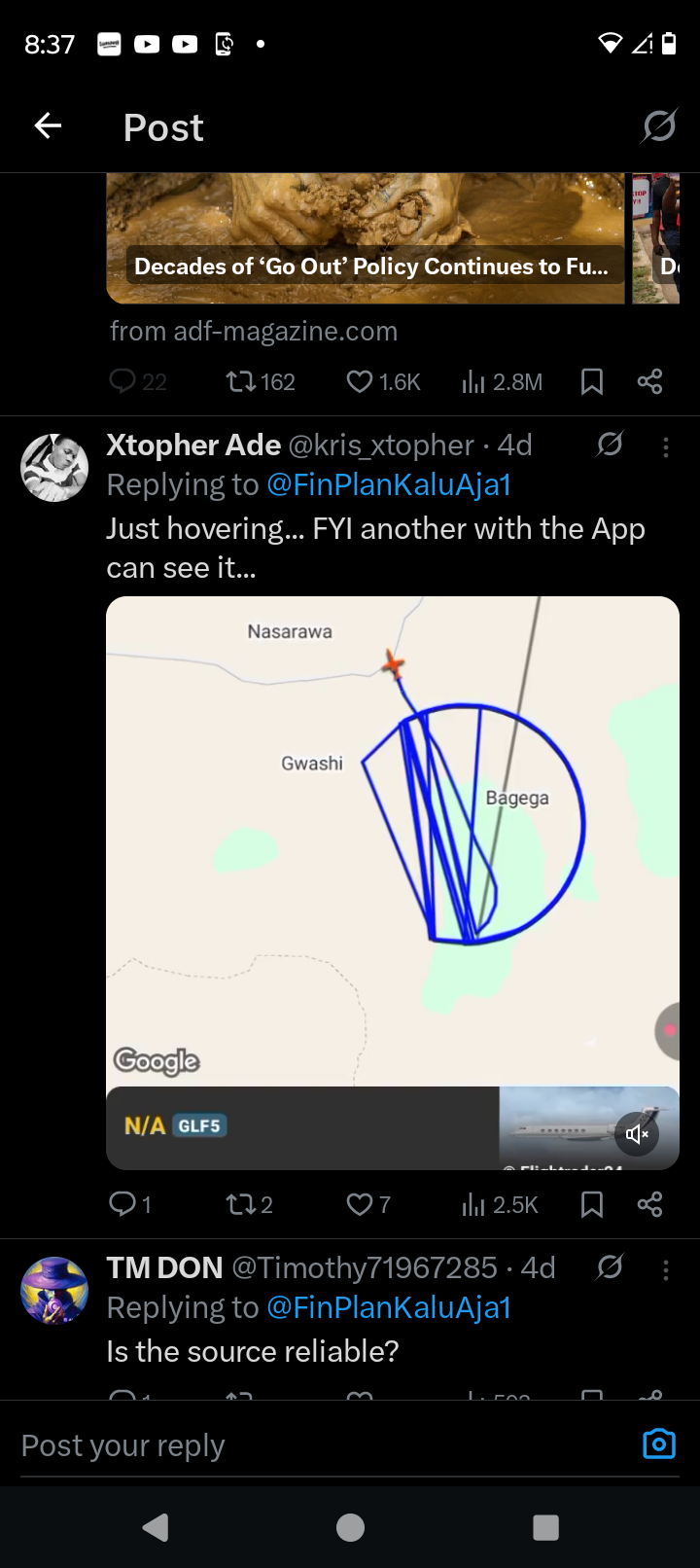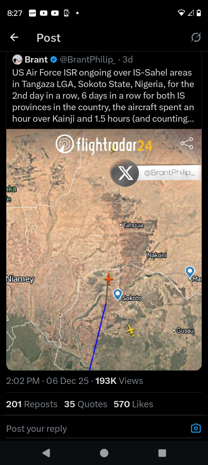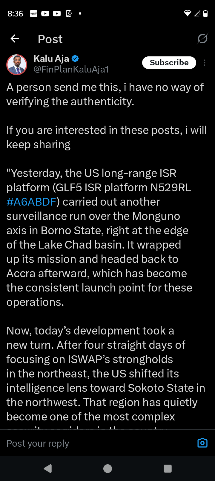 In a bid not to permit any escape route for those terrorists, the U.S., U.K, and France jointly deployed GLF5 ISR N529RL, a modified Gulfstream V (G5) business jet, operated by Tenax Aerospace for the U.S. military/intelligence community, serving as a powerful, long-range Intelligence, Surveillance, and Reconnaissance (ISR) platform, known for rapid deployment and extended missions over conflict zones like Nigeria, collecting vital intel using specialized sensors.